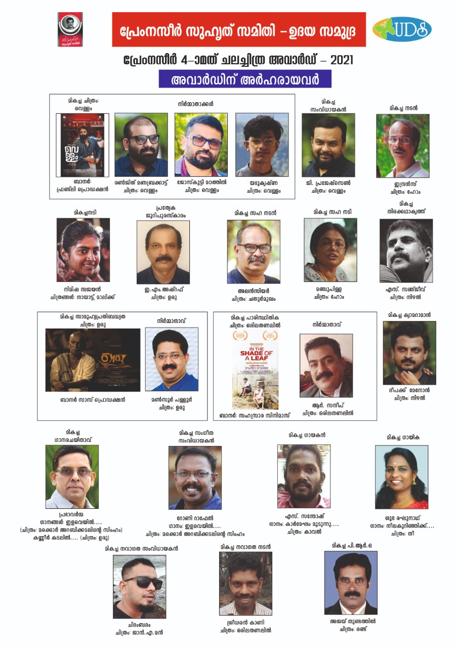 തിരു:- പ്രേംനസീർ സുഹൃത് സമിതി – ഉദയ സമുദ്ര സംഘടിപ്പിക്കുന്ന നാലാമത് പ്രേം നസീർ ചലച്ചിത്ര അവാർഡുകൾ പ്രഖ്യാപിച്ചു. ഫ്രെണ്ട്ലി പ്രൊഡക്ഷൻസിന്റെ ബാനറിൽ രൺജിത് മണ ബ്രക്കാട്ട്, ജോസ് കുട്ടി മഠത്തിൽ, യദുകൃഷ്ണ എന്നിവർ ചേർന്ന് നിർമ്മിച്ച വെള്ളം മികച്ച ചിത്രമായും , ഈ ചിത്രം സംവിധാനം ചെയ്ത ജി. പ്രജേഷ് സെൺ മികച്ച സംവിധായകനായും തെരഞ്ഞെടുക്കപ്പെട്ടു