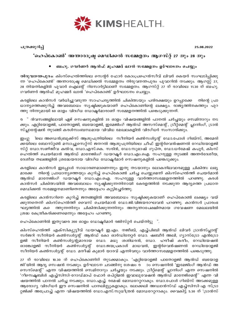 ‘ഹെപ്കോണ്’ അന്താരാഷ്ട്ര മെഡിക്കല് സമ്മേളനം ആഗസ്റ്റ് 27 നും 28 നും ബഹു. ഗവര്ണര് ആരിഫ് മുഹമ്മദ് ഖാന് സമ്മേളനം ഉദ്ഘാടനം ചെയ്യും