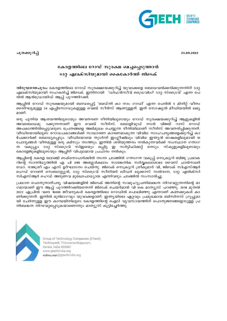 തിരുവനന്തപുരം: കേരളത്തിലെ റോഡ് സുരക്ഷയെക്കുറിച്ച് യുവാക്കളെ ബോധവല്‍ക്കരിക്കുന്നതിന് ടാറ്റ എലക്സിയുമായി സഹകരിച്ച് ജിടെക്. ഇതിനായി  ‘ഡിഫന്‍സീവ് ഡ്രൈവിംഗ് ടാറ്റ സ്ട്രൈവ്’ എന്ന പേരില്‍ ആന്‍ഡ്രോയിഡ് ആപ്പ് പുറത്തിറക്കി.
