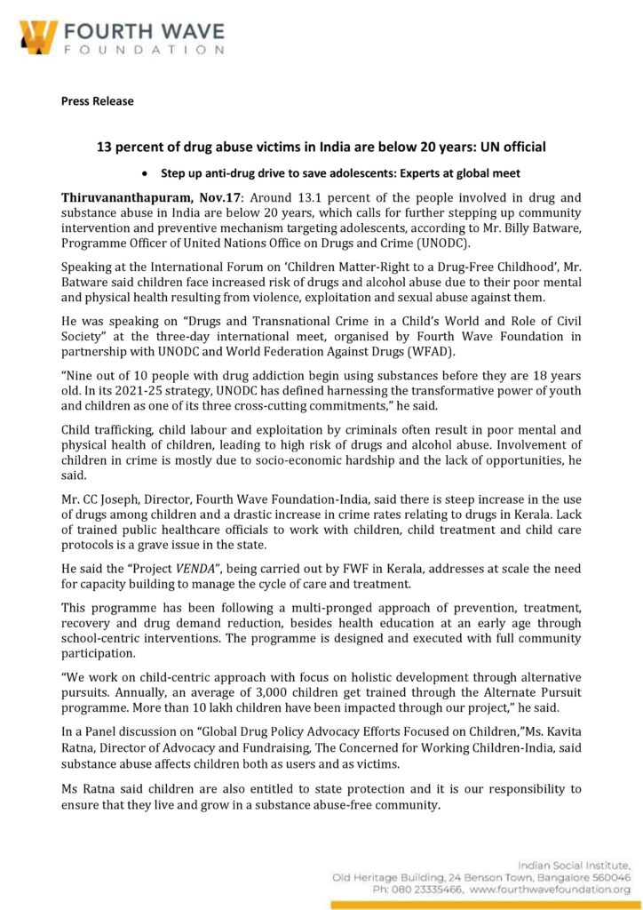 Mr. CC Joseph, Director, Fourth Wave Foundation-India, said there is steep increase in the use of drugs among children and a drastic increase in crime rates relating to drugs in Kerala. Lack of trained public healthcare officials to work with children, child treatment and child care protocols is a grave issue in the state.