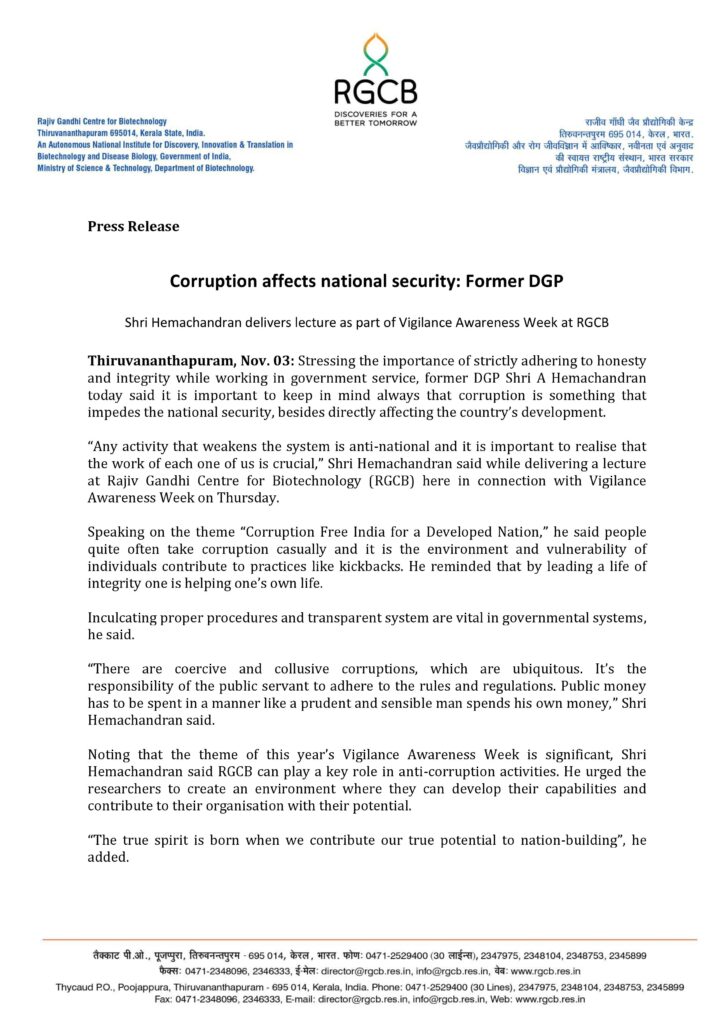 Noting that the theme of this year’s Vigilance Awareness Week is significant, Shri Hemachandran said RGCB can play a key role in anti-corruption activities. He urged the researchers to create an environment where they can develop their capabilities and contribute to their organisation with their potential.