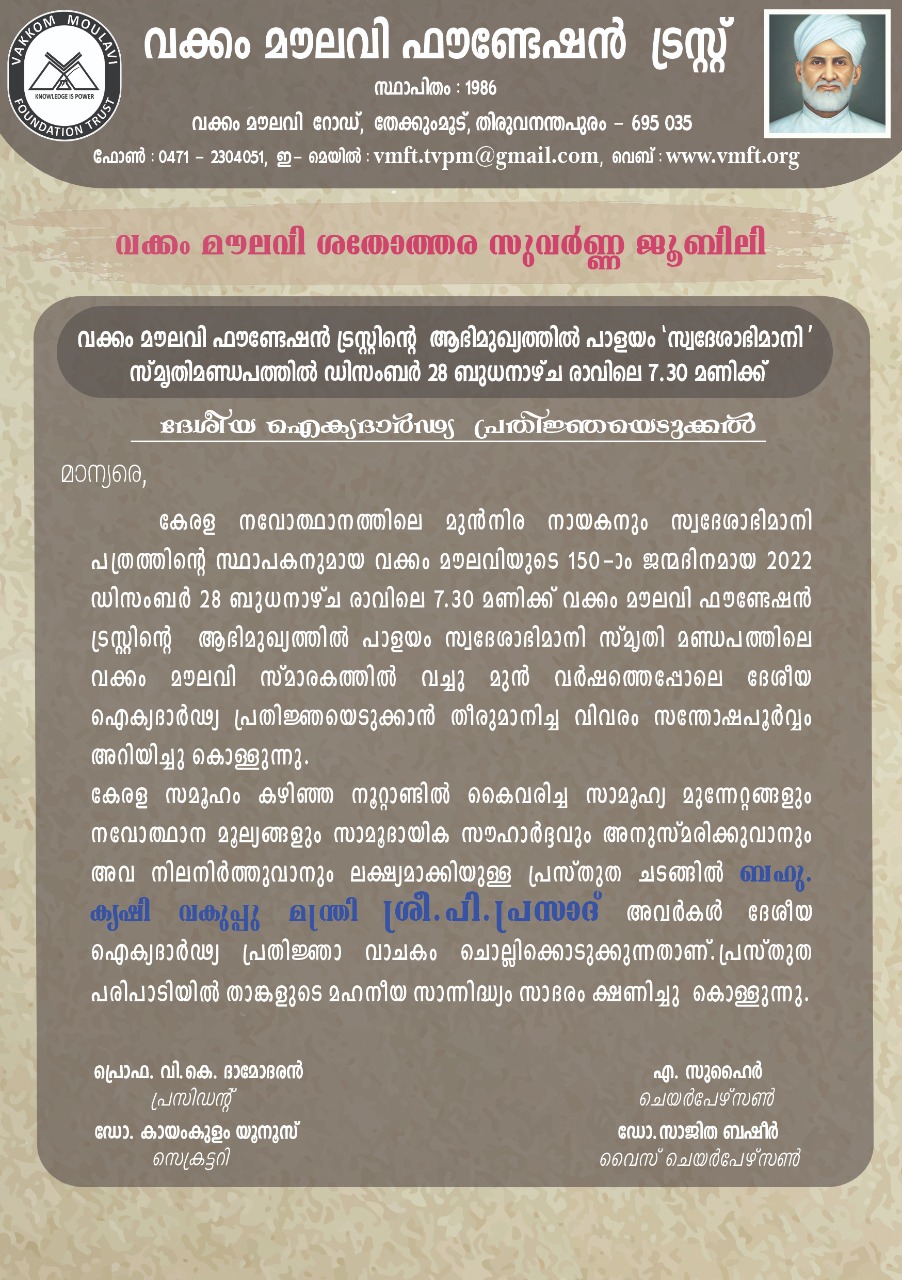 തിരുവനന്തപുരം : ‘സ്വദേശാഭി മാനി’ പത്രത്തിന്റെ സ്ഥാപകൻ വക്കം മുഹമ്മദ് അബ്ദുൽ ഖാദർ മൗലവിയുടെ 150-ാം ജന്മവാ ർഷിക ദിനത്തോടനുബന്ധിച്ച് ഒരുവർഷം നീണ്ടു നിൽക്കുന്ന ആഘോഷപരിപാടികൾക്കു പാളയത്തെ സ്വദേശാഭിമാനി ച ത്വരത്തിൽ 28 ന് രാവിലെ 7.30ന് മന്ത്രി പി.പ്രസാദ് ദേശീ യ ഐക്യദാർഢ്യ പ്രതിജ്ഞ ചൊല്ലിക്കൊടുത്തു തുടക്കം കു റിക്കും. വക്കംമൗലവി ഫൗണ്ട ഷന്റെ ആഭിമുഖ്യത്തിൽ സംഘ ടിപ്പിക്കുന്ന പരിപാടിക്കു പാ ഫ.വി.കെ.ദാമോദരൻ, എ.സു ഹൈർ, ഡോ.സാജിതാ ബഷീർ, ഡോ.കായംകുളം യൂനുസ് എ ന്നിവർ നേതൃത്വം നൽകും.
