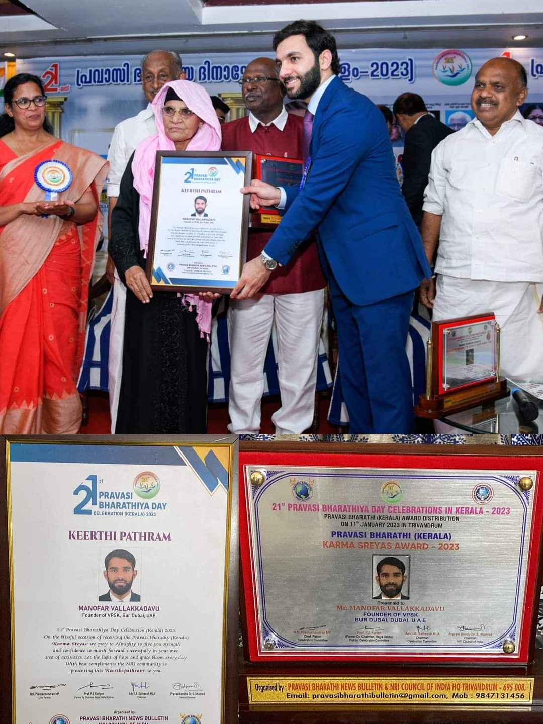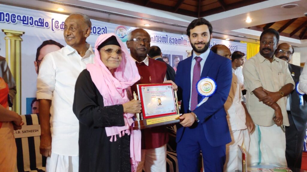 ഇരുപത്തിയൊന്നാമത് പ്രവാസി ഭാരതീയ ദിവസ് കേരള ആഘോഷങ്ങളുടെ ഭാഗമായി നടന്ന ചടങ്ങിൽ ,യു.എ.ഇ കോlൺസുലേറ്റ് കേരള കോൺസുൽ ജനറൽ ‘HE. ഒബൈദ് ഖലീഫ ബക്കിത്ത് അബ്ദുള്ള അൽഖാബി’യുടെ പക്കൽ നിന്നും ശ്രീ മനോഫറിന്റെ മാതാവ് അവാർഡ് ഏറ്റുവാങ്ങി