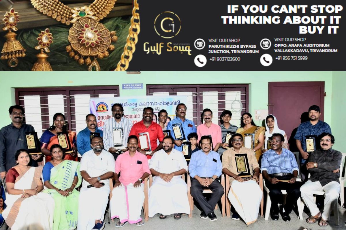 കേരള ഭാഷാ ഇന്സ്റ്റിറ്റ്യൂട്ട് മുന് ഡയറക്ടര് ഡോ. എം.ആര്. തമ്പാന്, ചെയര്മാന് കുന്നത്തൂര് ജെ.പ്രകാശ്, ഭാരവാഹികളായ സഹദേവന് കോട്ടവിള, കരിച്ചാറ നാദിര്ഷാ, അഡ്വ. കാട്ടാക്കട അനില്, പ്രശസ്ത കവി പൂവത്തൂര് സദാശിവന്, നാടന്പാട്ട് കലാകാരന് അജില് മണിമുത്ത് തുടങ്ങിയവര് സമീപം….!!!”