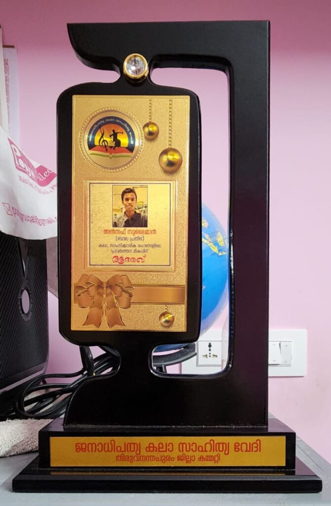 ”ജനാധിപത്യകലാസാഹിത്യവേദിയുടെ മികച്ച കലാസാംസ്കാരിക പ്രവര്ത്തകനുള്ള സദ്ഭാവനാ പുരസ്കാരം ദേശീയബാലതരംഗം സജീവ പ്രവര്ത്തകനും, പ്രേംനസീര് സുഹൃത് സമിതി വര്ക്കിംഗ് പ്രസിഡന്റുമായ എം.എച്ച്. സുലൈമാനും, ബാലപ്രതിഭാ പുരസ്കാരം ദേശീയബാലതരംഗം സംസ്ഥാന ഭാരവാഹിയും, ചിറയിന്കീഴ് താലൂക്ക് പ്രസിഡന്റുമായ അന്സഫ് സുലൈമാനും ദേശീയബാലതരംഗം ചെയര്മാനും, മുന് എം.എല്.എ.യുമായ അഡ്വ. റ്റി. ശരത്ചന്ദ്രപ്രസാദില് നിന്നും ഏറ്റുവാങ്ങുന്നു..