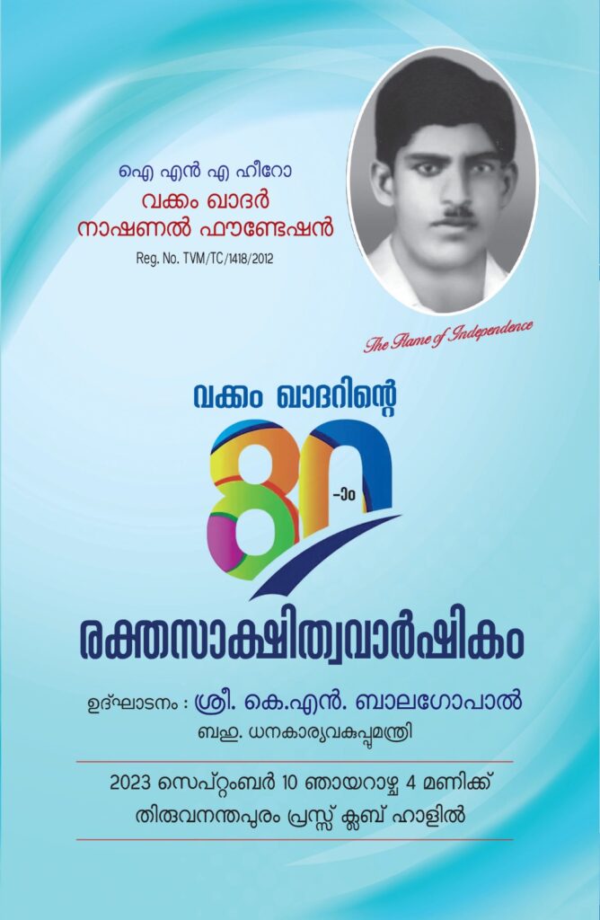 വക്കം ഖാദർ 80 രക്തസാക്ഷിത്യവാർഷികം : 2023 സെപ്റ്റംബർ 10 ഞായറാഴ്ച 4 മണിക്ക് തിരുവനന്തപുരം പ്രസ്സ് ക്ലബ്ബിൽ