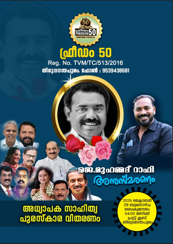 അധ്യാപകനും KPSTA സംസ്ഥാന വൈസ് പ്രസിഡന്റും ആയിരുന്ന ജെ മുഹമ്മദ് റാഫിയുടെ നാലാം അനുസ്മരണവും വിവിധ മേഖലകളിൽ കഴിവ് തെളിയിച്ചവർക്കുള്ള ഉപഹാരസമർപ്പണവും 2025ഒക്ടോബർ 29വൈകുന്നേരം 4മണിക്ക് തിരുവനന്തപുരം പ്രസ്സ് ക്ലബ്ബിൽ മുൻ എം പി. പന്ന്യൻ രവീന്ദ്രൻഉത്ഘാടനം നിർവഹിക്കും.