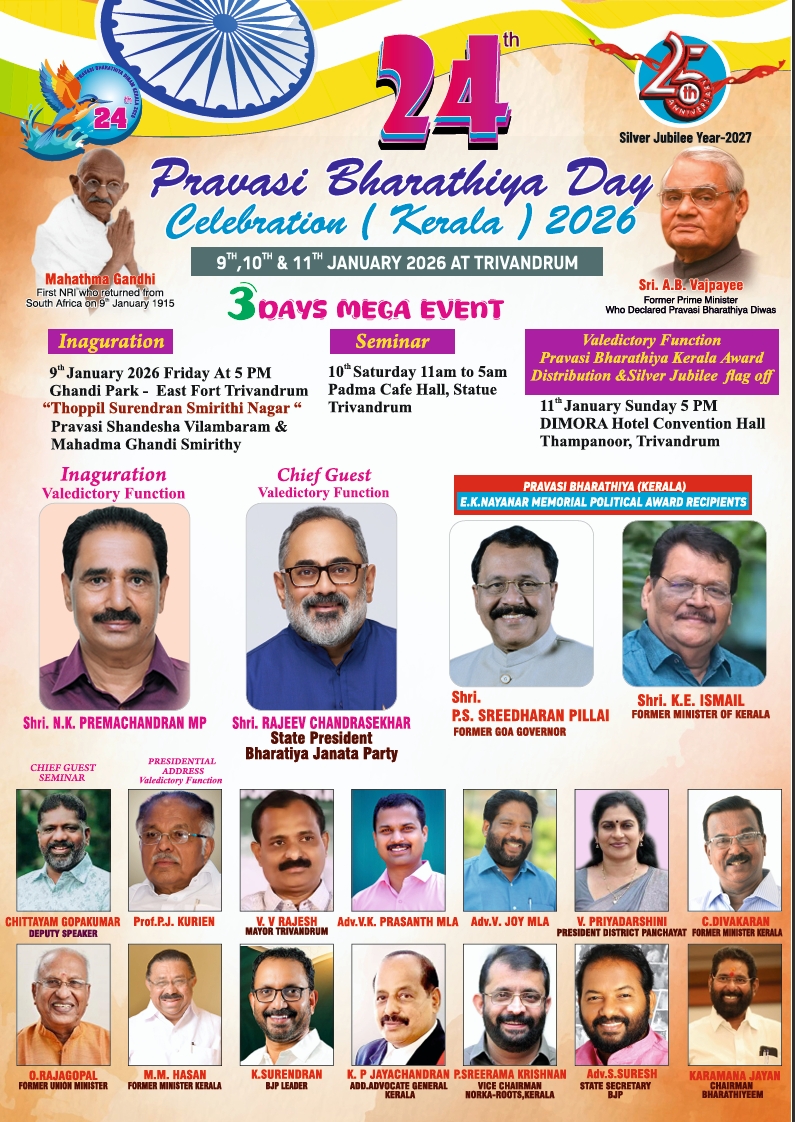 തിരു. ഇരുപത്തി നാലാമത് പ്രവാസി ഭാരതീയ ദിനാഘോഷത്തിന് ഇന്നലെ തുടക്കം കുറിച്ചു. കിഴക്കേകോട്ട ഗാന്ധി പാർക്കിൽ തോപ്പിൽ സുരേന്ദ്രൻ നഗറിൽ മുൻ മന്ത്രിയും മുതിർന്ന സി.പി.ഐ നേതാവുമായ സി.ദിവാകരൻ ഉദ്ഘാടനം ചെയ്ത്. കലാ പ്രേമി ബഷീർ ബാബു അദ്ധ്യക്ഷത വഹിച്ചു. നിരവധി പ്രമുഖ വ്യക്തികൾ പങ്കെടുത്ത്.2026 ലെ പ്രവാസി ഭാരതി അവാർഡുകൾ ഔദ്യോഗികമായി വേദിയിൽ വച്ച് പ്രഖ്യാപിച്ചു. നാളെ ( ഞായർ) വൈകുന്നേരം 5-30 ന് തമ്പാനൂർ ടിമോറാ ഹോട്ടലിൽ നടക്കുന്ന സമാപന സമ്മേളനത്തിൽ വച്ച് എൻ.കെ.പ്രേമചന്ദ്രൻ എം പി. വിതരണം ചെയ്യും.