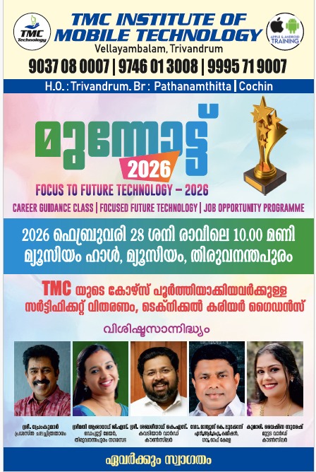 തിരു.നാക്ടെക്ട് അംഗീകാരത്തോടെ വെള്ളയമ്പലം റ്റി. എം. സി. ഇൻസ്റ്റിറ്റ്യൂട്ട് ഓഫ് മൊബൈൽ ടെക്നോളജി 28 ശനിയാഴ്ച്ച 10 മണി മുതൽ മ്യൂസിയം ആഡിറ്റോറിയത്തിൽ സംഘടിപ്പിക്കുന്ന മുന്നോട്ട് 2026 കരിയർ ഗൈഡൻസ് ക്ലാസ്സ് നടക്കും. എല്ലാ തൊഴിൽ അന്വേഷകരായ യുവജനങ്ങൾക്കും പങ്കെടുക്കാൻ അവസരം.